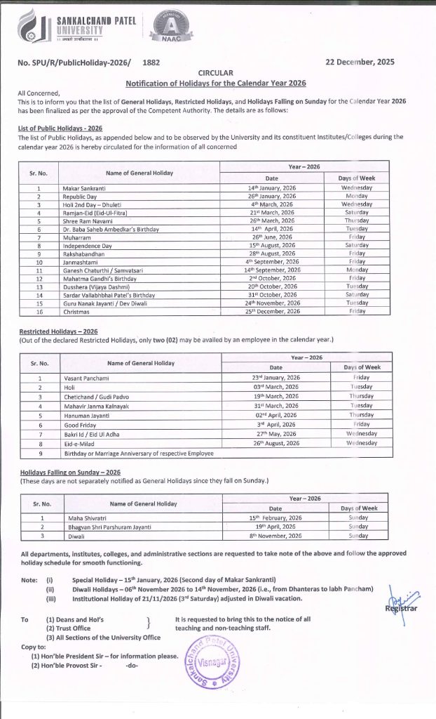 Sankalchand Patel University and NPDCH hosts a variety of student clubs focused on academics, culture, and community service. These clubs encourage holistic development through activities like coding, robotics, arts, NSS, and cultural festivals such as “Thanganat.” They help students grow personally and professionally beyond classroom learning.